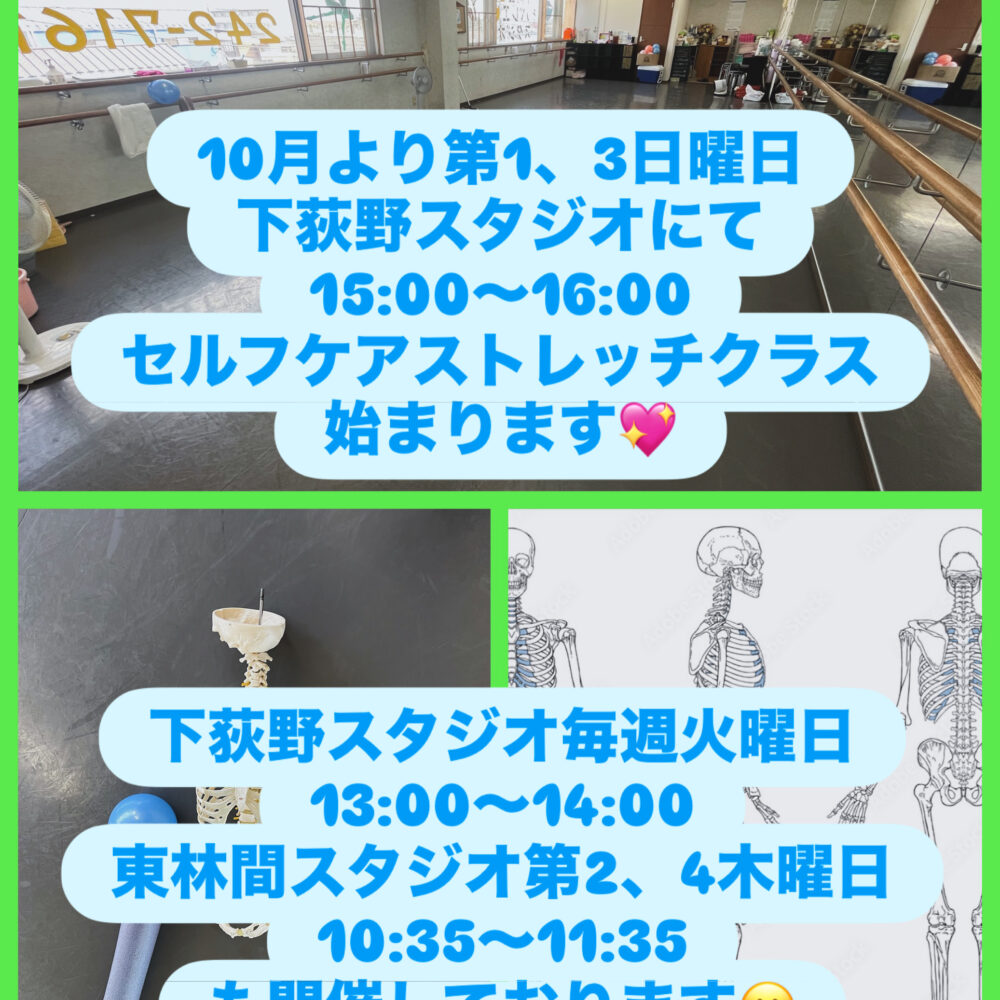 10月より第1、3日曜日15時〜16時、下荻野スタジオにて、セルフケストレッチクラス始まります! レッスン後は、なかなかスッキリするので、ぜひ皆様もご参加ください💞